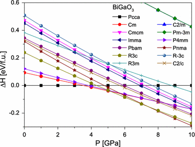 The calculations were done using the density functional theory (DFT) within the projector augmented wave (PAW) method [23, 24] as implemented in Vienna ab initio Simulation Package (VASP) [25]. The pseudopotentials used in our calculations were taken from the VASP pseudopotential library [24]. The d-states were treated as core states for Bi and as valence states for Ga. We considered the following space groups: Pcca, Cm, Cmcm, Pbam, R3c, Pnma, C2/c, and Imma. These space groups have been reported in the experimental studies on BiGaO3 under hydrostatic or chemical pressure [4, 5, 6, 7, 9, 10]. In addition, we have also investigated five space groups: Pm-3m, P4mm, R3m, C2/m, and R-3c, which have not been observed in experiment but were investigated theoretically in the Ref. [3]. Experimentally established structural data from Refs. [7, 10] were used as input for the calculations. The Brillouin zone integrations were performed using 12 × 12 × 12, 8 × 8 × 8, 8 × 8 × 8, and 6 × 6 × 6 Gamma-centered k-point grids for cell with 5- (Pm-3m, P4mm, R3m), 10- (C2/m, Cm, R3c, R-3c), 20- (C2/c, Cmcm, Imma, Pcca, Pnma), and 40-atoms (Pbam), respectively. A kinetic energy cutoff 520 eV and a total energy convergence threshold of 10−6 eV were used. The Brillouin zone sampling was checked to render converged results. The increasing number of k-points has small effect on phase energy differences. The cell shape and internal atomic positions were optimized within GGA with the Perdew–Burke–Ernzerhof (GGA-PBE) functional [26] and local density approximation (LDA) [27]. All results presented in this work were done within GGA-PBE until otherwise stated. All aforementioned structures were relaxed by minimizing their enthalpy at a series of pressures between 0 and 20 GPa.