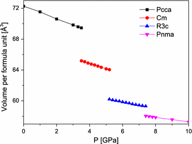Volume of the unit cell (per f.u.) for the most stable structures of BiGaO3 as a function of pressure