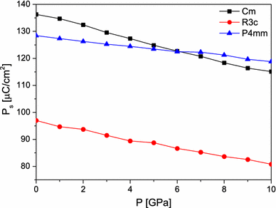 Polarization magnitude as a function of pressure for the monoclinic Cm, tetragonal P4mm, and rhombohedral R3c phase of BiGaO3