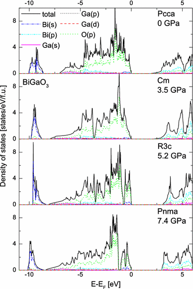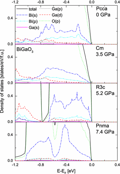The total and partial density of states of four different phases of BiGaO3 at their transition pressures