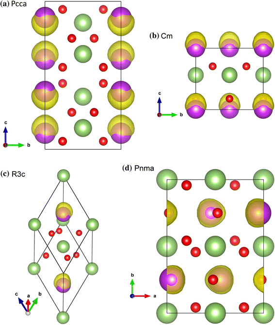 Electron localization function (ELF) of the most stable phases of BiGaO3 at the value of 0.9. The figure was generated using the VESTA visualization package [42]