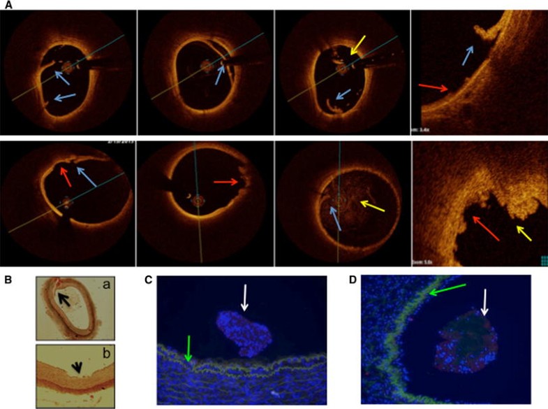 OCT and histologic imaging of balloon overstretch injury of the peripheral (femoral and iliac) arteries. A OCT imaging, showing intima and media rupture (red arrow), vessel dissection (blue arrow), and platelet-rich white thrombus (yellow arrow). B Histology, showing (a) artery rupture with hemorrhage (black arrow) and (b) severe intima and media injury (black arrow). Swine iliac arteries at 1 h after balloon overstretch injury, shown with MOVAT staining and under ×4(a) and ×8(b) magnification. C, D Tumor necrosis factor (TNF)-alpha immunofluorescence staining. Cell-rich (c) and cell-poor (d) intraluminal thrombus, with TNF-alpha expression of the platelets and inflammatory cells (red color). Autofluorescence of the endothelium (green arrow) (Color figure online)