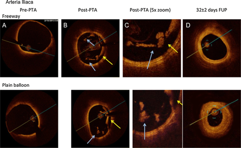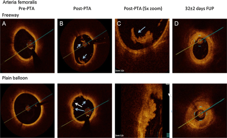 OCT images of the femoral arteries before and after percutaneous transluminal angioplasty (PTA) with Freeway™ (upper panel) and plain balloon (bottom panel) and at follow-up (FUP). a Pre-PTA: Image taken before percutaneous transluminal angioplasty (Pre-PTA) of the native femoral artery. b Post-PTA: Image taken after balloon overstretch injury of femoral arteries, showing white platelet-rich thrombi (blue arrow) at the site of intimal rupture and intraluminally. Small attaching white thrombi (white arrow). c Post-PTA (×5 magnification) of a white intraluminal thrombus (blue arrow) partially attaching to the vessel wall with an irregular structure and shadowing (upper panel). The bottom panel shows severe rupture of the intima and media (white arrow) with attaching white thrombi. d 32 ± 2 days FUP: Medium- and high-grade obstruction of the femoral arteries at 32 ± 2 days after balloon overstretch injury. Shrinkage of the artery suggests severe constrictive remodeling after plain balloon dilation (Color figure online)