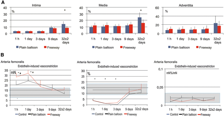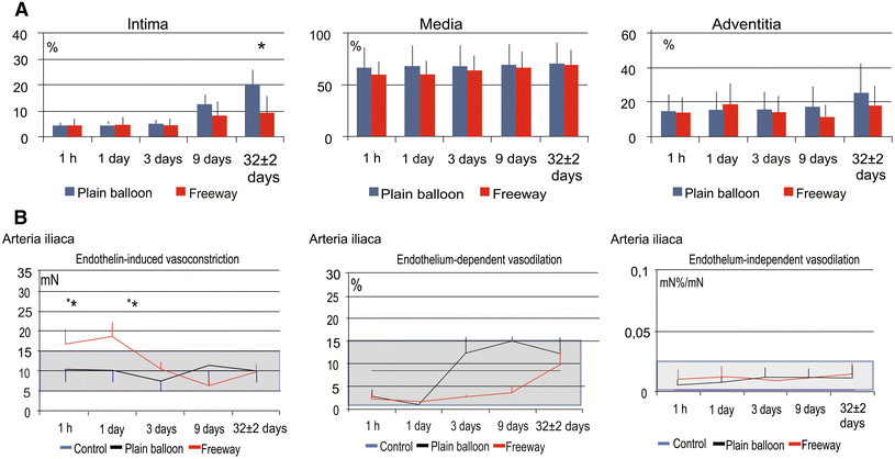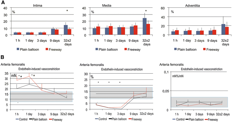 Time-dependent development of arterial tissue fibrosis (intima) and fibrous collagen (media) after balloon dilation, and the vasomotor response (vasoconstriction and vasodilation) of the femoral arteries. a Time-dependent increase in arterial tissue fibrosis/collagen in the different femoral artery layers (intima, tunica media, and adventitia) after dilation with the plain balloon or Freeway™ paclitaxel-coated balloon. b Endothelin-induced contraction of the femoral artery (left). Susceptibility to contraction at 1 day post-dilation with either type of balloon, followed by rapid normalization. Profound injury of the endothelium-dependent vasodilatory reaction, with no difference between the two balloon types (mid). No change in endothelium-independent vasodilation (right). The gray range represents the normal value ±1 standard deviation. *P < 0.05 between balloon and control, + P < 0.05 between Freeway™ and plain balloon. Number of arteries listed in Fig. 1