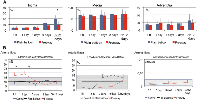 The present pre-clinical investigation aimed to assess the vascular response to antiproliferative drug accumulation in the peripheral arteries after balloon dilation with the paclitaxel-coated balloon Freeway™ (Eurocor, Germany). The impact was examined in terms of vessel remodeling and vasodilatory or vasoconstrictive capacity of the femoral or iliac arteries compared to with plain balloon dilation.