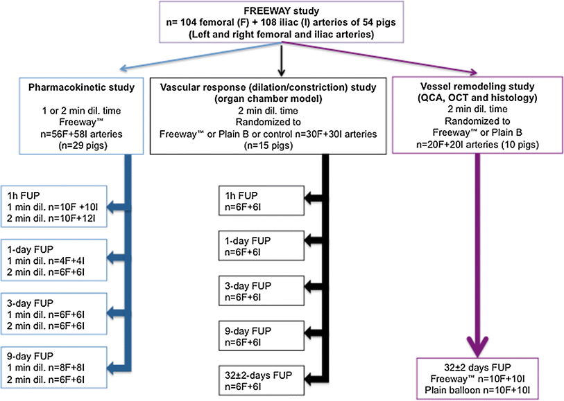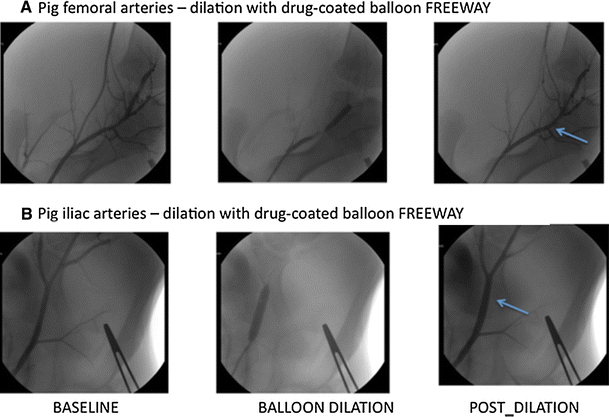 The Freeway™ DCB is commercially available in Europe and in several non-USA countries for human peripheral artery interventions. However, animal studies of this device still provide a unique opportunity to examine the reaction of the host tissue; to investigate tissue pathology and inflammation; to study drug retention, delivery, kinetics, and toxicology; to assess systemic drug disposition or other harmful effects related to the application of drugs and/or a foreign body; and to further explore their mechanisms of action. These data acquired from animal research can directly lead to improvements of technological concepts and to refinements of intravascular devices. In contrast, human trials typically focus on the safety and efficacy of an interventional therapy, without attaining new information regarding the underlying biology.