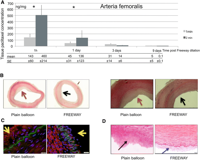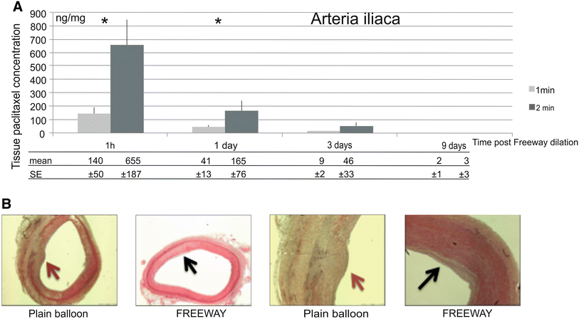 Pharmacokinetic and histologic studies. a Arteria iliaca tissue paclitaxel concentration at different follow-up times after a 1- or 2-min balloon inflation time. b Cross-sections of porcine iliac arteries at 32 ± 2 days after overstretch dilation, showing uneven distribution of neointimal hyperplasia (red arrow) after dilation with a plain balloon, and a circumferential small degree of neointima (black arrow) after Freeway™ dilation (left two panels). Arterial Sects. (×4 magnification) with neointimal hyperplasia after dilation with either plain balloon or Freeway™ (right two panels). Focal neointimal hyperplasia at the site of rupture of the internal elastic membrane, with inflammatory cells in the media and adventitia (red arrow). Minimal neointimal hyperplasia in arteries dilated with Freeway™ (black arrow). Hematoxylin–eosin staining (Color figure online)
