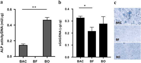 Characterization of isolated primary bovine cells cultured on tissue culture plates for 3 days. a ALP activity normalized to DNA. b Quantification of sGAG normalized to DNA. Data are presented as mean ± SD (n = 3, *p < 0.05 and **p < 0.01). c Alcian blue staining of P1 cells on tissue culture plates