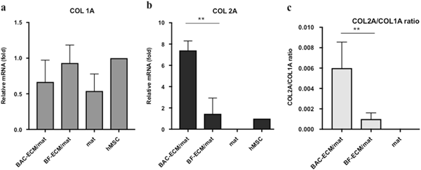 Relative gene expression in hMSCs cultured on scaffolds in the absence of chondrogenic induction. Gene expression is normalized to the starting hMSCs (set as 1) and the housekeeping gene GAPDH. The ratio of COL2A1/COL1A1 (c) was calculated from the relative expressions of COL1A1 (a) and COL2A1 (b) as described in Materials and Methods. Data shown are a representative of two independent experiments. Data are presented as mean ± SD (n = 3, **p < 0.01)