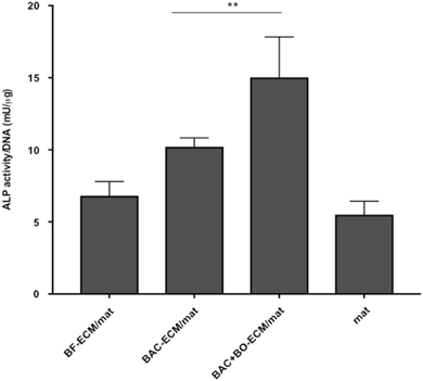 The osteogenic differentiation of hMSCs on ECM/mats. The hMSCs were cultured on control or ECM/mats with osteogenic induction for 14 days. The ALP activities of cells were analyzed and normalized to the DNA of each sample. Data are presented as mean ± SD (n = 6 for BAC-ECM/mat and n = 3 for all the other groups). **P < 0.01