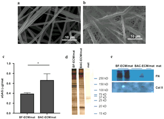 Characterization of ECM/polymer composite fiber mats. Electrospun fiber mats made of pDTEC was analyzed using SEM a. BACs were cultured on fiber mats to confluence. The mat was decellularized and analyzed using SEM b. c The sGAG contents in BF-ECM/mat and BAC-ECM/mat were measured using Blyscan Assay Kit. Data are presented as mean ± SD (n = 4, *p < 0.05). d The ECM/mats were lysed and analyzed by SDS-PAGE followed by silver staining. e The presence of fibronectin (FN) or type II collagen (Col II) in the lysates was analyzed by Western blotting with specific antibodies