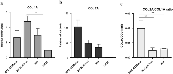 Relative gene expression in hMSCs cultured on scaffolds in the presence of chondrogenic induction. Gene expression is normalized to the starting hMSCs (set as 1) and the housekeeping gene GAPDH. The ratio of COL2A1/COL1A1 (c) was calculated from the relative expressions of COL1A1 (a) and COL2A1 (b) as described in Materials and Methods. Data shown are a representative of two independent experiments. Data are presented as mean ± SD (n = 3, *p < 0.05 and **p < 0.01)