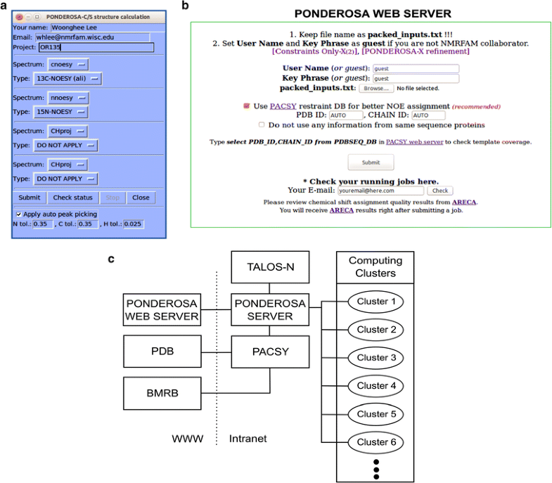 NMR-based 3D protein structure calculation. a Calculation 3D structure by PONDEROSA-C/S (two-letter-code c3) offers direct job submission from NMRFAM-SPARKY to the Ponderosa Web Server. It supports fully automated mode with and without automated NOESY peak picking and semi-automated mode with partially or fully assigned NOESY data. b Ponderosa Web Server is a freely available web resource that transmits the structure calculation command to the Ponderosa Server running at NMRFAM. c Diagram showing the integrated architecture of Ponderosa Web Server and Ponderosa Server at NMRFAM
