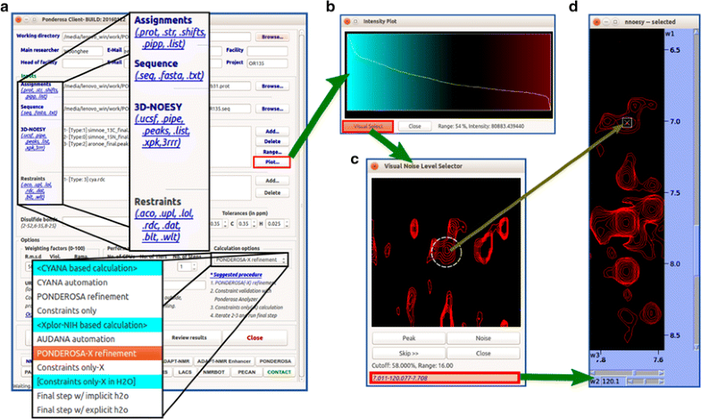 Ponderosa Client supports several formats and settings for structure calculation. a Ponderosa Client accepts several types of input including NOE (raw spectra: .ucsf, .pipe; peak list: .peaks, .list, .xpk, 3rrr), RDC (.rdc), and SAXS (.dat) for Xplor-NIH based structural calculations. b The optimized noise threshold for NOESY peak picking is determined automatically by Intensity Plot, which ranks the intensities of NOE peaks and uses an r −6 (r: distance between two protons) approach to estimate the intensity corresponding to the 5.5 Å cutoff (blue robust range, black mixture of real peaks and noise, red noise range). c Alternatively, the user can employ the Visual Select tool to determine the noise level. This tool randomly selects a position where the chemical shift assignments suggest that a peak should be found, and the user decides whether the signal is a real peak or noise. d The Visual Select tool is integrated with NMRFAM-SPARKY for better decision making. Clicking the peak position in the Visual Select tool enables the user to navigate (two-letter-code up) to the position of the peak in a spectrum displayed by NMRFAM-SPARKY
