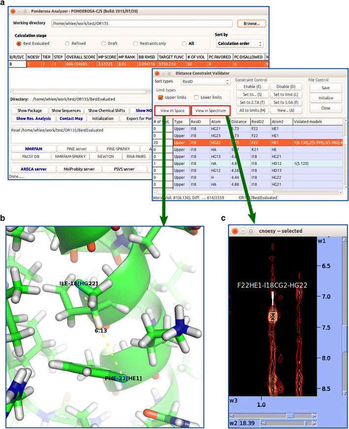 Ponderosa Analyzer provides tools for validating assignments, constraints and structures that are integrated with Enhanced PyMOL and NMRFAM-SPARKY. a Distance Constraint Validator is a tool for analyzing distance information extracted from NOESY data. b 3D illustration of the constraint selected (Enhanced PyMOL command @p). c NOESY spectrum highlighting the experimental evidence for the selected constraint (NMRFAM-SPARKY two-letter-code up). The user can manually adjust or exclude the examined constraint for the next run by means of the Constraint Control buttons in the Distance Constraint Validator