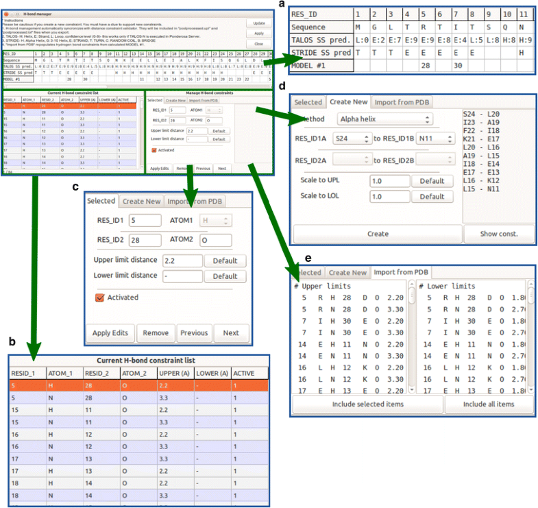 H-bond manager is a Ponderosa Analyzer tool that provides an easy way to add or remove hydrogen bond constraints. a The H-bond manager panel shows secondary structure information from TALOS-N prediction and from close distances detected structural models from a previous calculation. b Current hydrogen bond constraints are listed in the lower-left panel. During the first structure calculation, they are generated automatically from NOE cross peak patterns. The updates in the lower-right panel change the content in this panel. c An H-bond constraint selected in the lower-right panel can be modified or removed. d New constraints from characteristic secondary structures can be easily added. e Close atom distances from the most recent structure determination can be reviewed as possible H-bonds and can be added as constraints for the next structure determination