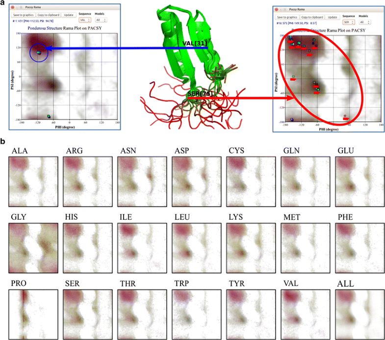 Pacsy Rama provides a set of images, derived from quantitative analysis of φ and ψ angles of proteins in the PACSY database, that provide a visual representation of favorable dihedral regions according to amino acid type or for all amino acid types. The images are useful for assessing the structural quality and dynamic characteristics of NMR solution structure of a protein. a In this example, the φ/ψ angles for V31 in the 20 models representing the structure, are closely clustered in an energetically favorable region, whereas the φ/ψ angles for S75 from the various models are highly dispersed consistent with the residue being present in an ill-defined region of the protein. b Pacsy Rama images for the 20 common amino acids and all combined. These images are downloadable from (http://pine.nmrfam.wisc.edu/download_packages.html)