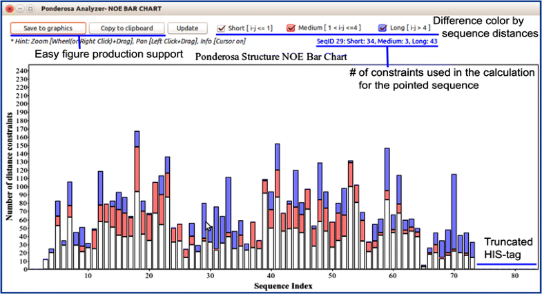 The NOE Bar Chart tool in Pacsy Analyzer represents the number and type (white short range; red medium range; blue long range) of distance constraints for each residue used in a structure calculation