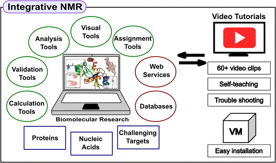 The Integrative NMR method for conducting biomolecular research. This integrated set of software packages, which can be installed on a laptop or desktop computer—optionally as part of a virtual machine, cover a wide range of data analysis and visualization steps in the workflows of biomolecular NMR research. The software tools interoperate seamlessly with external servers and databases. Video tutorials cover all operations