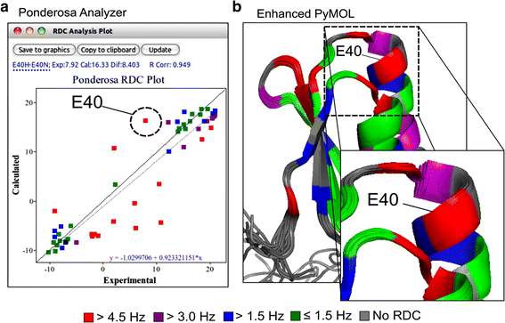 RDC Analysis Plot tool in Ponderosa Analyzer. a The RDC Analysis tool plots experimental RDC data versus RDC data calculated from the structure generated by Ponderosa Server. The linear least squares fitted line (gray dashed line) indicates the agreement between the experimental and calculated RDCs. b The shortcut command @cr (color by RDC violations) in Enhanced PyMOL uses the RMSD report generated by Ponderosa Server to visualize the correlation between experimental and calculated RDCs as a means for identifying potential errors in the 3D structure (or the in the RDC data)