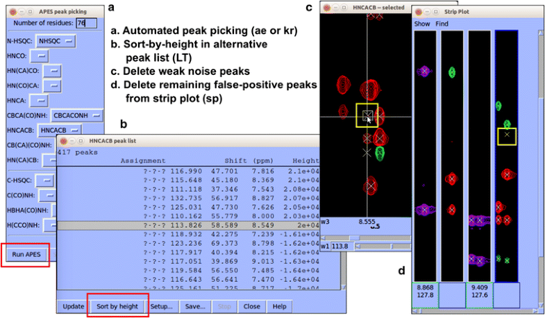 Recommended semi-automated peak identification method in NMRFAM-SPARKY. a Use APES (two-letter-code ae) or restricted peak picking (two-letter-code kr) for automated peak identification. b Use alternative peak list window (two-letter-code LT) to sort peaks by intensities. c Delete weak noise peaks from spectrum view. d Use strip plot (two-letter-code sp) to delete any remaining false-positive peaks and add missing peaks