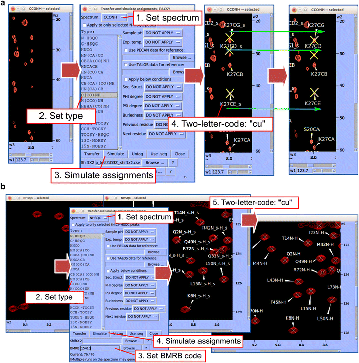 Predict-and-confirm method for fast semi-automated chemical shift assignment. a Efficient method for assigning a C(CO)NH spectrum. In the Transfer and simulate assignment window (two-letter-code: ta), set Spectrum and Type; then click the Simulate button to annotate predicted assignments on the experimental spectrum (yellow ‘X’s). Drag each yellow X onto the nearest peak in the spectrum, and type “cu” to confirm the assignment. The yellow ‘X’s are now centered on the position of the experimental peak. b Illustration of how Predict-and-confirm can be used to import assignments from a BMRB entry. The BMRB assignments are displayed over the spectrum, and the user can then adjust and confirm them