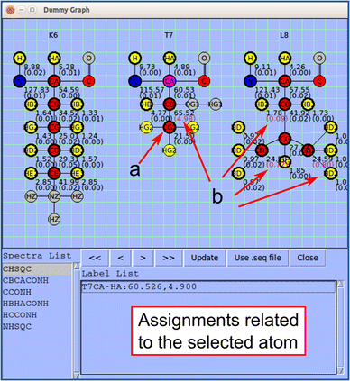 Dummy Graph is molecular structure visualization tool that shows the atoms in a three-residue stretch and indicates which atoms have been assigned. Also shown is the average chemical shift and standard deviation (in ppm) from the positions of all peaks in the different spectra supporting a given assignment. An atom can be selected by clicking; this turns its background pink as shown for T7CA. The panel at the bottom shows assignments (in the Label List) related to the selected atom from the spectrum selected in the Spectra List. a A thick line around an atom and chemical shift indicates that the atom is already assigned. Otherwise, a thin line around an atom indicates that it is not yet assigned. b Large chemical shift deviations are written in purple to alert the user to the possibility of an erroneous assignment