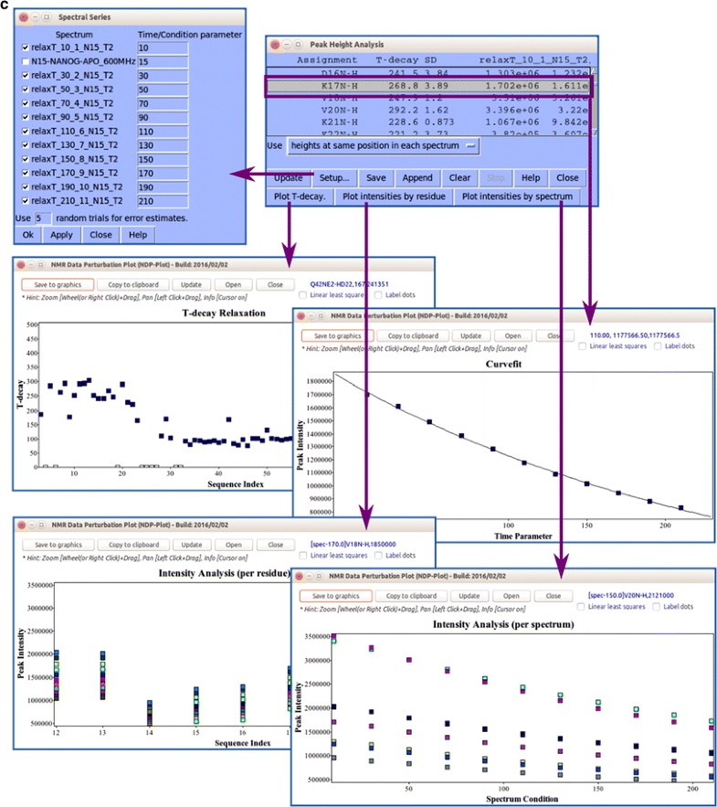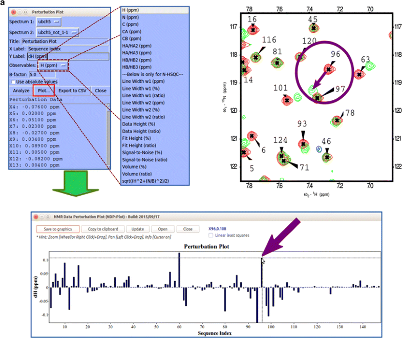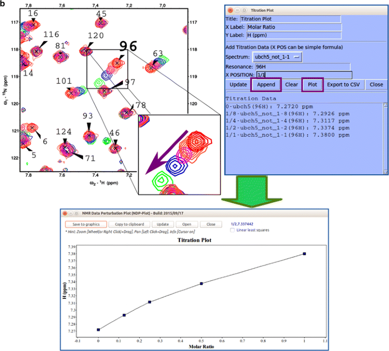 NDPPlot is a tool fully integrated into NMRFAM-SPARKY for visualizing spectral changes. a Perturbation plot (two-letter-code np). The arrows point to the change in the chemical shift of residue 96. The contour plot overlays (two-letter-code ol or eo) two selected 1H–15N HSQC spectra: one recorded with (green contour) and one without (red contour) added substrate. The displacement of the signal assigned to residue 96 is highlighted within the circle. NDPPlot generates the bar chart shown to plot the chemical shift differences between two spectra along the sequence; this is achieved by choosing the two spectra and the observable to be compared (in this case, the chemical shift of amide protons) in the Perturbation plot window and by clicking Plot. b Titration Plot (two-letter-code ni) visualizes chemical shift changes from a titration experiment. Results are plotted by the NDPPlot program. This example shows how the 1H NMR chemical shift of residue 96 from the 1H-15N HSQC spectra changes upon the addition of a substrate. The spectrum shows the overlap (two-letter-code ol) of spectra without and with four increasing levels of added substrate. Contour colors are set by the two-letter-code ct (with 0 for red, 1/8 for tomato, 1/4 for magenta, 1/2 for blue, 1 for green). In the Titration Plot window, by choosing the spectra and the observable to be compared (in this case, the 1H chemical shift of H96) and clicking the Plot button, NDPPlot graphs 1H NMR chemical shift of H96 as a function of the molar ratio. c The Peak Height Analysis tool (two-letter-code rh) can be used to analyze results from relaxation experiments or any other peak intensity related experiments. After choosing a series of assigned spectra with different time/condition parameters, clicking the Plot T-decay button can be used to visualize the relaxation time constant as a function of residue number or by choosing a single residue, the decay in its peak intensity over time/condition. Alternatively, per residue and per spectrum intensity analysis options are available for observing overall differences between residues or spectra