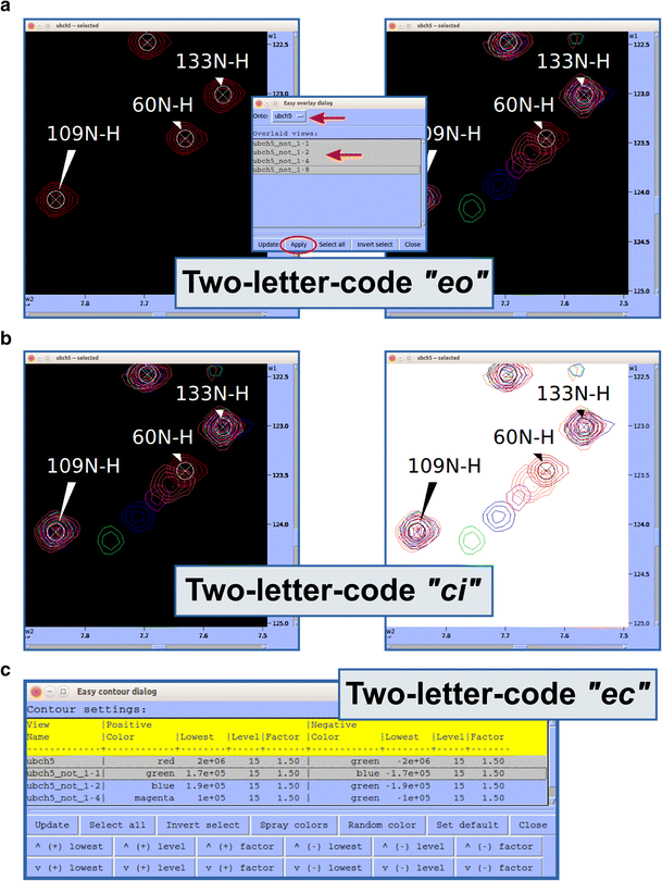 Useful tools for spectral series analysis. a Easy overlay dialog. We developed much simpler tool for spectral overlay than traditional “ol” tool particularly for many spectra. It is activated by two-letter-code “eo”. Simply, user can choose a spectrum “onto” and select spectra to “overlay” by mouse dragging and clicking with Ctrl and Shift keys. When most of all spectra in the project need to be overlaid, user can simply click Select all button and exclude spectra by Ctrl key and mouse clicks. b Change inverse background. We understood the visual limitation of black background color for spectral series analysis if user needs to color spectra differently. Thus, we developed two-letter-code “ci” to change background color from black to white and from white to black. The background color can be set differently and if ornament color is black and white, they are automatically changed to the other color, and so markers such as crosshair are. c Easy contour dialog. This tool is activated by two-letter-code “ec”. It can be used to adjust contour color, level and threshold of multiple spectra all at once