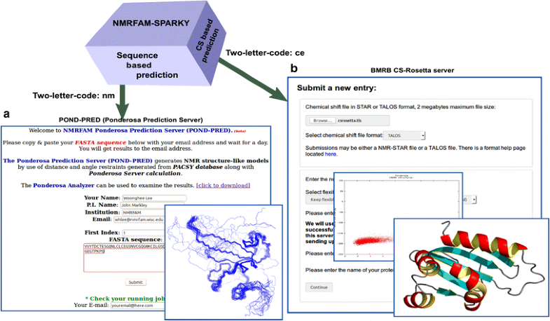 Three-dimensional structures can be predicted by sequence-based method and chemical shift-based methods in NMRFAM-SPARKY. a POND-PRED (two-letter-code nm) is a webserver offered by NMRFAM for predicting protein 3D structures from amino acid sequences. b CS-Rosetta is a chemical shift-based 3D structure prediction program; it is accessibly from NMRFAM-SPARKY (two-letter-code ce) on a web server hosted by BMRB