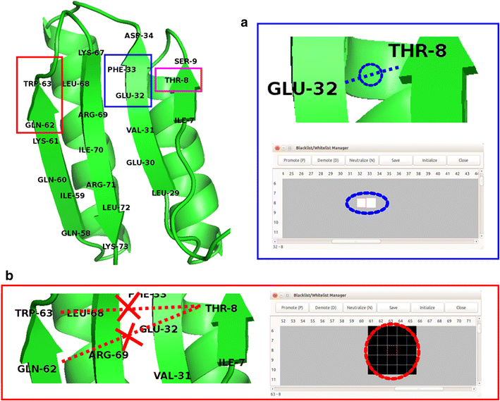 Blacklist and Whitelist are constraint types supported exclusively by PONDEROSA-C/S for resolving ambiguity in NOESY data by applying different weighting factors to the inter-residue contacts. The Blacklist/Whitelist Manager provides a graphical user interface to change the weighting of individual residue–residue contacts. a As an example, if the user is certain that T8-E32 and T8-E33 are close enough to have NOE cross peaks, the corresponding grids can be promoted and colored white. b If the user is certain that T8-W63, T8-Q62 and the surrounding residues are too distant to produce NOE cross peaks, the corresponding grids can be blacked out to avoid errors in automated NOE assignment and structure calculation by the Ponderosa Server