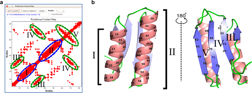 Contact Map is a Ponderosa Analyzer tool that assists with structural and spectral analysis of the protein. Because it displays inter-proton distances shorter than 5.5 Å, unlike maps that simply show Cα–Cα contacts, it can be used to predict cross peaks in NOESY spectra. a Contact Map displays patterns that identify secondary structure. b Cartoon representation of the 3D structure of the protein with secondary structural elements colored (Enhanced PyMOL commands @sc and @cs). Good agreement is seen between the secondary structural elements shown in a and b (I and II, alpha helices; III, parallel sheet; IV, anti-parallel sheet consisting of two strands far apart in the sequence; V, anti-parallel sheet consisting of two strands close in the sequence connected by a short turn)