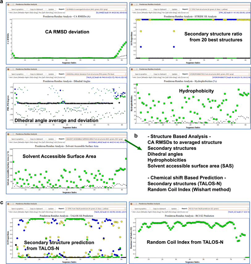 The Residue Analysis tool in Ponderosa Analyzer provides visual representation of the properties of amino acid residues plotted by sequence number. a Examples of structure-based properties derived from the 20 best models from the structure determination. b List of the features supported by structure-based analysis and chemical shift-based prediction. c Examples of chemical shift-based predictions. Secondary structure and random coil index (S2) values from TALOS-N based on backbone chemical shifts. The user can compare properties predicted from the backbone chemical shifts with those from the calculated structures