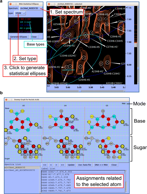 Tools developed for assisting chemical shift assignment of nucleic acids. a NMRFAM-SPARKY supports covariance ellipses for RNA 1H and 13C chemical shifts first introduced in the CHESS2FLYA program. Statistical ellipses is a tool in NMRFAM-SPARKY (two-letter-code SE) that overlays color-coded ellipses on the spectra to outline the range of chemical shifts expected for different RNA bases. The peaks underlined in cyan are near the center of the cyan ellipse, which corresponds to Uracil. b Dummy Graph for Nucleic Acids (two-letter-code DG) is a tool for visualizing atoms of DNA or RNA residues; base atoms of are shown at the top and those of the sugar and phosphate are shown at the bottom. The panel below shows assignments related to the selected atom shown in pink (U4H6) from the selected spectrum