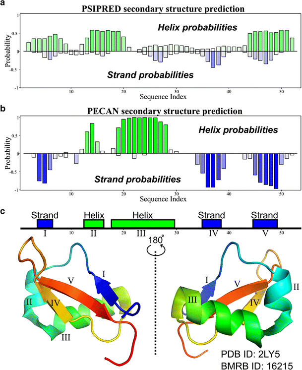 Sequence-based and chemical shift-based predictions from NMRFAM-SPARKY of the secondary structure of the protein brazzein (PDB ID: 2LY5, BMRB ID: 16215). The illustration was made by NDPPlot. a Sequence-based prediction by PSIPRED (two-letter-code PP) could not predict secondary structures correctly and the probabilities are not confident. b Chemical shift-based prediction by PECAN (two-letter-code n6). c Secondary structures from PDB deposited structure. The PECAN prediction matched perfectly with the secondary structural elements determined from the structure