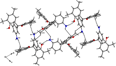 Crystal structures of two bis-phenols namely bis-(3,5-dimethyl-2-hydroxyphenyl)(3-amino phenyl)methane 1 and bis-(3,5-dimethyl-4-hydroxyphenyl)(3-aminophenyl) methane 2 are determined. The compound 1 crystallises in monoclinic P21/c with a = 12.2579(16) Å, b = 16.0906(19) Å, c = 10.6664(13) Å, β = 115.417(7)°, V = 1900.2(4) Å3 whereas 2 crystallizes in monoclinic C2/c, a = 9.2538(2) Å, b = 18.6579(4) Å, c = 23.2725(5) Å, β = 98.796(2)°, V = 3970.89(15) Å3. The crystal lattice of both the compounds shows presence of N–H···π interactions but no O–H···π interactions.