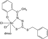 Two coordination octahedral Sn(IV) complexes [Sn(L)2] and cis-[SnCl2(L)(dmso)], where H2L is 2-hydroxyacetophenone (S-benzydithiocarbazate), were prepared and characterized by elemental analysis, IR, NMR (1H, 13C), 119Sn Mössbauer spectroscopies and X-ray diffraction techniques to investigate their structural properties. Both crystallize in the Monoclinic system, with parameters: a = 8.1905(3), b = 30.8811(15), c = 12.8959(7) Å, β = 94.465(3)° and Z = 4 for [Sn(L)2] and a = 8.5247(2), b = 21.5445(7), c = 12.3706(3) Å, β = 96.932(2)° and Z = 4 for cis-[SnCl2(L)(dmso)]. In both complexes, the Sn(IV) central atom is coordinated in a distorted octahedral geometry with the thiolate ligand (L2−) coordinated via O, N and S atoms. The 119Sn Mössbauer spectroscopy of the complexes were studied and the results revealed that both complexes posses isomer shift (δ) and quadrupole splitting (Δ), which are almost the same.