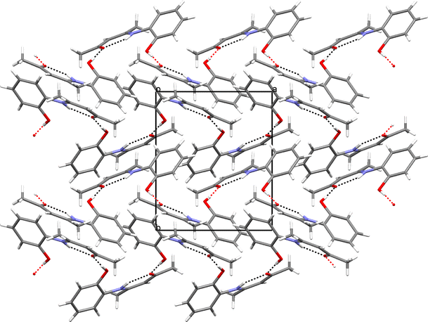 The crystal packing of H2hpac as seen along [001] direction [6]. Hydrogen bonds are shown as dashed lines