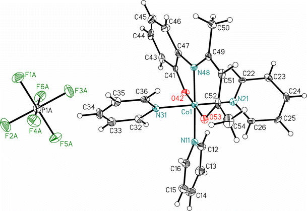 Perspective view of the complex, [CoL(py)3]+PF6 − with labelling scheme [17]. The displacement ellipsoids are drawn at 50 % probability level, hydrogen atoms are shown as spheres of arbitrary radii