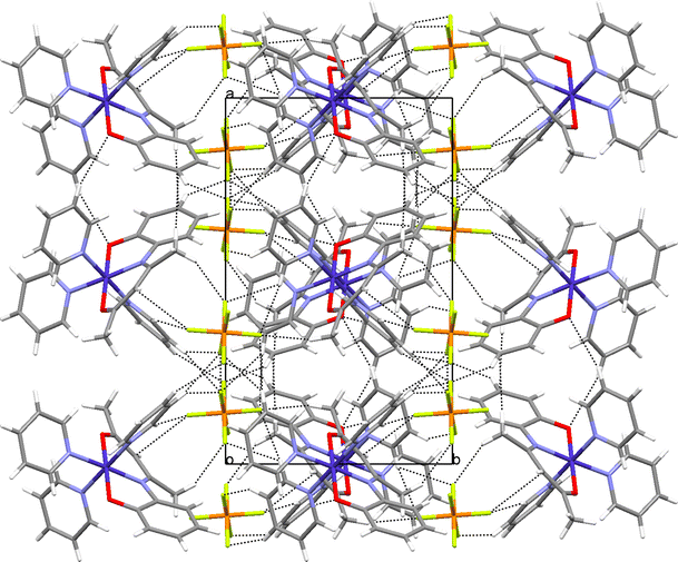 The crystal packing of [CoL(py)3]PF6 as seen along [001] direction [33]. The dashed lines denote short contacts (cf. text)