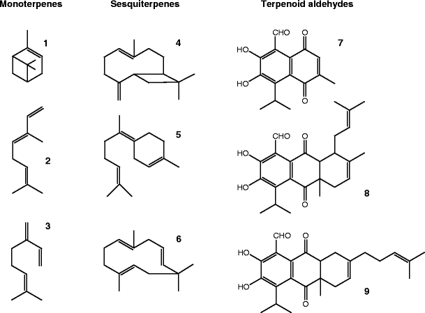 Terpenoid products of three structural classes, which are accumulated in glands of the foliage of Gossypium hirsutum. 1 α-pinene, 2 (E)-β-ocimene, 3 myrcene, 4 (E)-β-caryophyllene, 5 γ-bisabolene, 6 α-humulene, 7 hemigossypolone, 8 heliocide H1, 9 heliocide H2