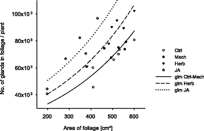 Effect of leaf area and treatment on the number of glands in the total foliage of 4-week-old cotton plants, which were either damaged at leaves 2 and 3 mechanically (Mech), fed upon by larvae of Spodoptera littoralis (Herb), treated with jasmonic acid (JA), or left as untreated controls (Ctrl) 7 days previously. Regressions were drawn based on transformed data from a generalized linear model (GLM) with a quasi-Poisson error distribution. Data for control and mechanically damaged plants were combined due to factor level reduction