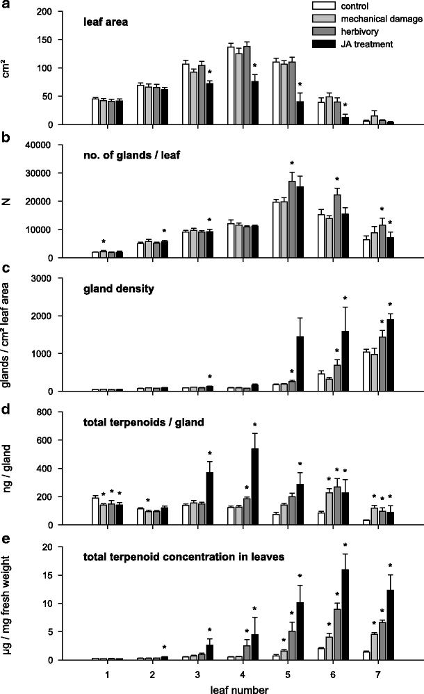 Gland number per leaf revealed a similar distribution pattern among leaves for all treatments: The oldest leaf 1 contained the lowest gland number, which increased gradually toward leaf 5 and again decreased in the expanding leaves 6 and 7 (Fig. 6b). Young leaves (5–7) of herbivore-treated plants showed significantly elevated numbers of glands in comparison to corresponding leaves of control plants. Lower but still significant increases in gland numbers were found for leaves 2, 3, and 7 (youngest leaf) of plants that were treated with JA compared to control leaves. Mechanical damage showed nearly no effect on gland number.
