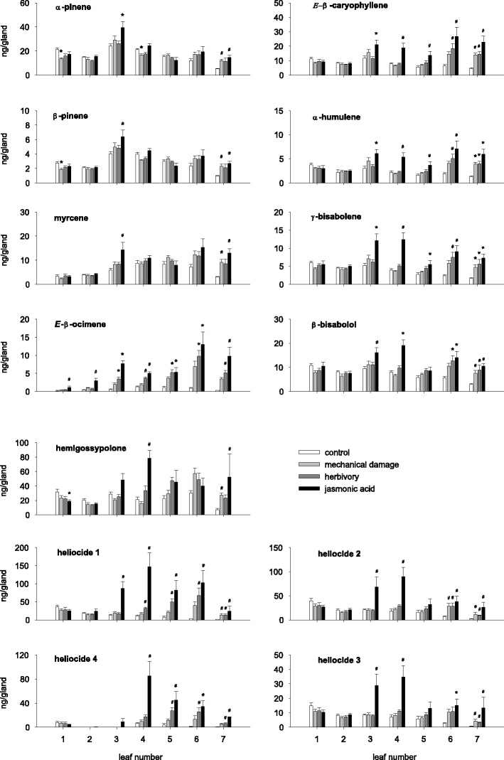 Mean (±SE, N = 3–6) concentrations of terpenoids per gland among true leaves of 4-week-old Gossypium hirsutum plants, which were either damaged at leaves 2 and 3 mechanically (Mech), fed upon by larvae of Spodoptera littoralis (Herb), treated with jasmonic acid (JA), or left as untreated controls (Ctrl) 7 days previously. Asterisks indicate significant differences (P < 0.05) from corresponding control leaves based on one-way ANOVA’s and Bonferoni post hoc tests. Pound signs indicate significant differences (P < 0.05) from corresponding control leaves based on Kruskall–Wallis one-way ANOVAs on ranks and Dunn’s post hoc tests