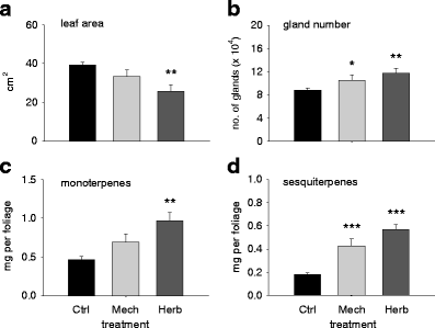 Mean (±SE, N = 6) leaf area, number of glands, and monoterpene- and sesquiterpene levels of leaf 4 from 3-week-old Gossypium hirsutum plants, which were either damaged mechanically at leaves 1 and 2 (Mech), fed upon by larvae of Spodoptera littoralis (Herb) on one cotyledon, leaves 1 and 2, or left as untreated controls (Ctrl). Asterisks indicate significant differences from corresponding control leaves based on one-way ANOVAs (a), on analyses of codeviance with leaf area as covariable (b), and ANCOVAs with leaf area as covariable (c, d). *P < 0.05; **P < 0.01; ***P < 0.001
