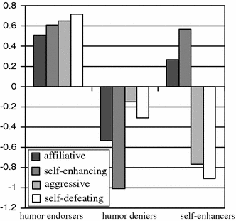 Thirdly, the humor type “self-enhancers” was characterized by below average aggressive and self-defeating humor, average affiliative humor, and clearly above average self-enhancing humor. This reflects a humor type that focuses on humor to make oneself feel better even when not in the company of others. Analyses of variance showed impressively that this type might be most adaptive: On all measures of self-regulatory strategies, self-esteem, and well-being, self-enhancers scored highest. This finding showed that a self-enhancing humor style might be most beneficial for well-being and underlines the adaptive correlates of self-defeating and aggressive humor being absent.