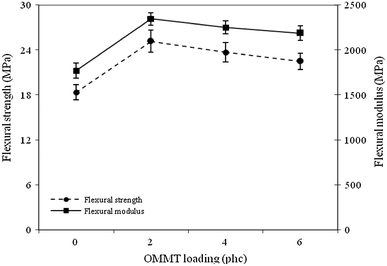 Flexural strength and modulus of HDPE/BF composites at different loadings of OMMT