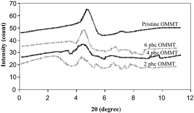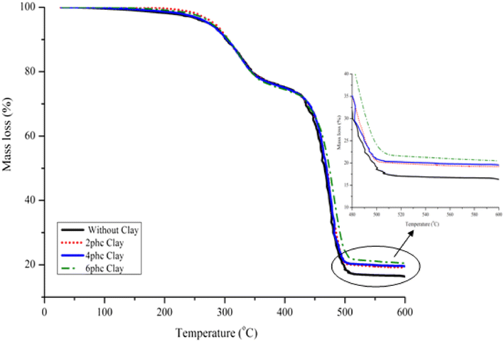 The incorporation of 6 phc clay loading into the HDPE matrix resulted in an increase in the Tc to about 118.1 °C, with a degree of crystallinity (Xc) of 37.02%, which was due to heterogeneous nucleation of the nanoclays. The polymer molecular chains can crystallize by themselves through a self-nucleation effect (homogeneous nucleation) or by introducing a nucleating agent (heterogeneous nucleation) [21]. The nucleation effect is effective at low concentration (2 phc), but at higher content (6 phc) the high amount of fillers cannot effectively induce nucleation due to fillers–fillers contacts (agglomeration) and limited space for crystal nucleation/growth.
