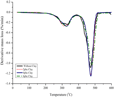 DTG curves of HDPE/RF composites with different OMMT content
