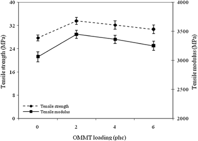 Tensile strength and modulus of HDPE/BF composites at different loadings of OMMT